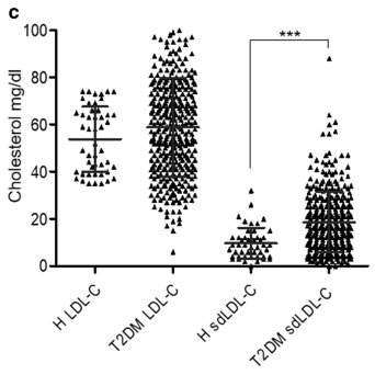 2型糖尿?。═2DM)患者與微血管和大血管并發(fā)癥相關(guān),這些并發(fā)癥會(huì )導致心腦血管問(wèn)題[1-3]。有研究表明,糖尿病患者發(fā)生冠狀動(dòng)脈疾?。–AD)和心肌梗死(MI)的風(fēng)險是健康人的2~3倍,84%的≥65歲糖尿病患者死于心臟病和卒中[4]。大多數2型糖尿病患者血脂代謝異常,血脂譜特征為脂質(zhì)三聯(lián)征,即甘油三酯(TG)升高,高密度脂蛋白膽固醇(HDL-C)下降、低密度脂蛋白膽固醇(LDL-C)正?;蜉p度升高,小而密低密度脂蛋白(sdLDL)顆粒增多。研究顯示,sdLDL-C的水平是2型糖尿病及并發(fā)癥的風(fēng)險因子。