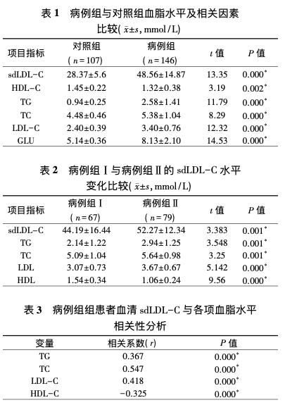 齊齊哈爾醫學(xué)院附屬第三醫院的楊秀靜等[6],將146例T2DM患(其中男85例,女61例;年齡30~70歲)中單純T2DM患者67例為病例組Ⅰ,T2DM及并發(fā)癥患者79例為病例組Ⅱ;另選擇同期健康體檢者107名作為對照組。兩組均進(jìn)行sd LDL-C、GLU、TC、TG、LDL-C、HDL-C檢測。觀(guān)察T2DM及其并發(fā)癥患者血清中sdLDL-C水平變化情況并分析其臨床應用價(jià)值。研究結果表明,sd LDL-C在T2DM患者中升高明顯,sd LDL-C與TG、TC、LDL-C呈正相關(guān)與HDL-C呈負相關(guān)。觀(guān)察sd LDL-C的變化情況可用于預測T2DM并發(fā)癥病變發(fā)生風(fēng)險。