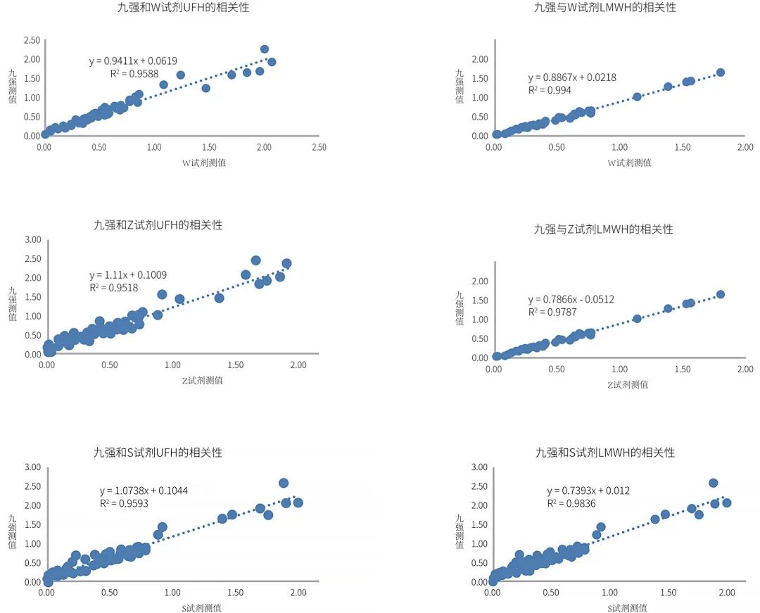 九強抗Xa測定試劑盒(發(fā)色底物法)通過(guò)顏色變化來(lái)測定抗凝強度/血藥濃度,線(xiàn)性寬,抗干擾能力強,精密度高,與市場(chǎng)主流廠(chǎng)家試劑相關(guān)性良好,R2>0.95,可滿(mǎn)足臨床檢測需求。