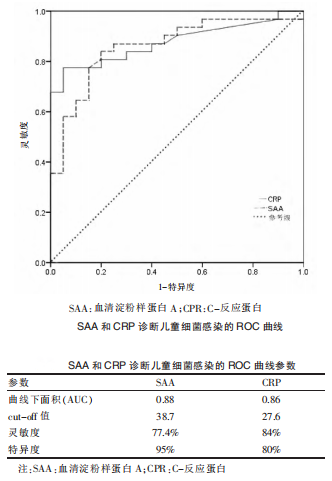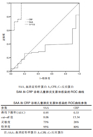 李攀等[3]探討血清淀粉樣蛋白A(SAA)和C-反應蛋白(CPR)檢測對兒童支原體肺炎的診斷價(jià)值。包括支原體感染患兒124例(支原體感染組)、細菌感染患兒35例(細菌感染組),同期健康體檢兒童20例(對照組),分別測定和分析三組SAA和CRP水平,并應用ROC曲線(xiàn)進(jìn)行分析。結果表明:SAA檢測對診斷兒童肺炎支原體感染和細菌感染的準確性均較高;CRP檢測對診斷兒童細菌感染準確性較高,但對于鑒別診斷兒童肺炎支原體的意義較小。SAA 檢測可用于兒童肺炎支原體感染的鑒別診斷,應在臨床中廣泛應用。