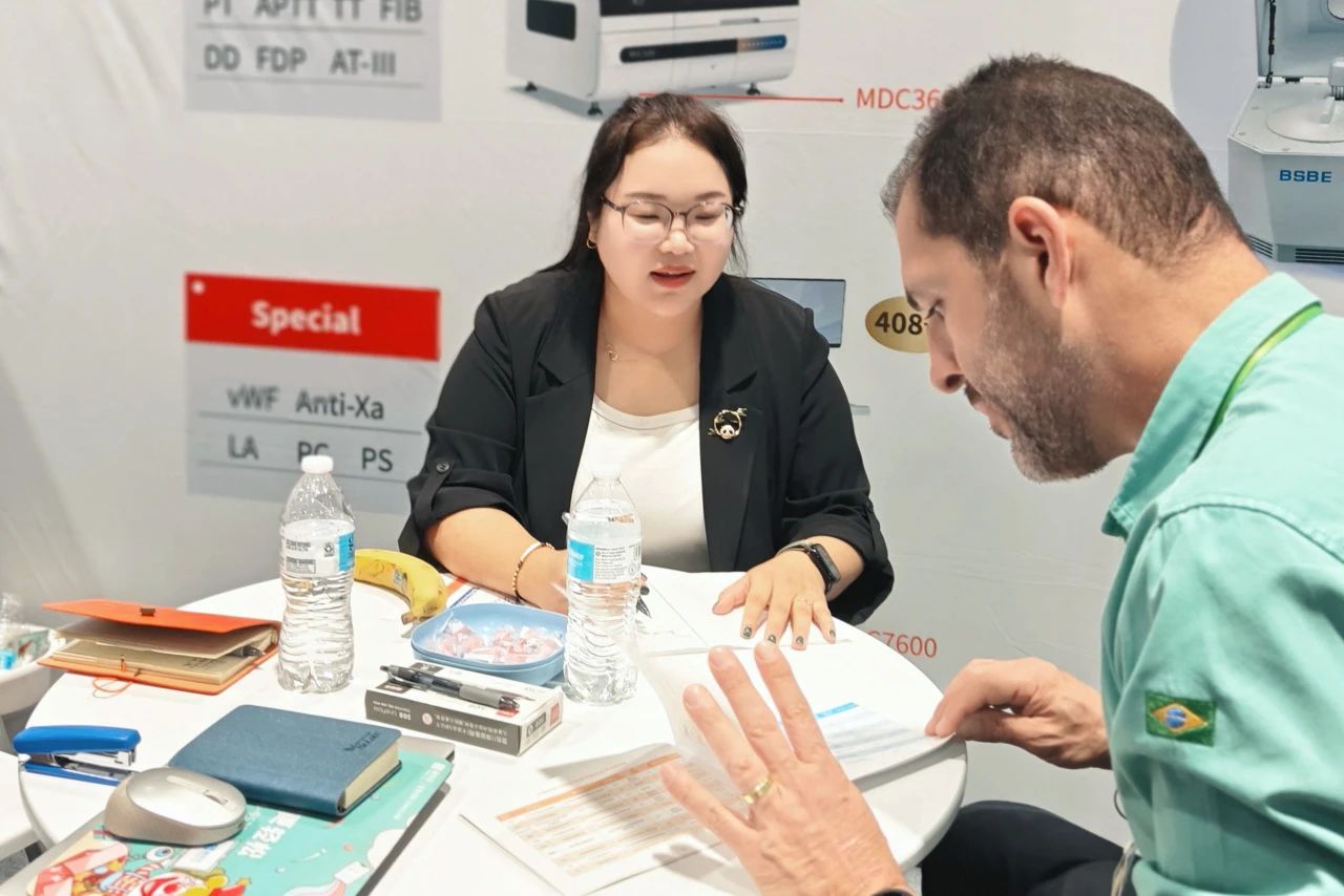 九強生物的產(chǎn)品以精準的檢測性能、高效的工作效率和可靠的質(zhì)量贏(yíng)得了廣泛贊譽(yù)。展會(huì )現場(chǎng),九強生物的展位始終人頭攢動(dòng),來(lái)自世界各地的參觀(guān)者紛紛駐足,與公司專(zhuān)業(yè)團隊深入交流,了解產(chǎn)品的特點(diǎn)和優(yōu)勢。九強團隊以熱情、專(zhuān)業(yè)的態(tài)度接待每一位參觀(guān)者,詳細介紹產(chǎn)品的技術(shù)亮點(diǎn)和臨床應用經(jīng)驗,與客戶(hù)分享九強生物在體外診斷領(lǐng)域的創(chuàng )新理念和實(shí)踐成果。通過(guò)深入的交流,九強生物不僅讓世界更好地了解了中國體外診斷技術(shù)的發(fā)展水平,也進(jìn)一步拓展了國際業(yè)務(wù)交流渠道,與眾多潛在客戶(hù)建立了緊密聯(lián)系。