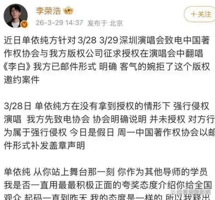 2026年3月29日下昼14时许,歌手李荣浩正在片面社交平台宣告长文,公然向单依纯举事。 他披露,单依纯团队为规划3月28日、29日的深圳演唱会,曾通过中邦音乐著作权协会及他的版权公司,申请翻唱其原创作品《李白》。 李荣浩方已于3月27日通过邮件体式,昭着且谦虚地婉拒了这项授权申请,并将结果同步见知了音著协。 然而,正在3月28日晚的首场上演中,单依纯照旧登台演唱了这首歌。